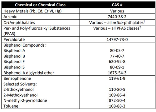 The list was first proposed in 2018 as part of Amazon's initiative to remove chemicals of concern that: (1) meet the criteria for classification as a carcinogen, mutagen, reproductive, or other systemic toxicant; or (2) are persistent, bioaccumulative, and toxic. Revised in December 2020, Amazon's Kitchen brands will no longer contain the following in food contact packaging: