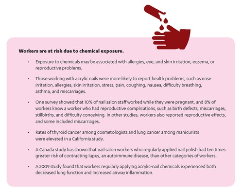 Research on nail salon products revealed a widespread yet overlooked epidemic: manicurists working up to 70 hours per week were being exposed to toxic chemicals found in nail products they used to pamper clients on a daily basis.