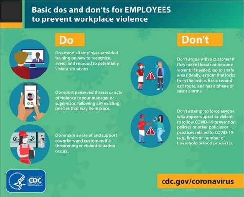 These policies may include requiring masks to be worn by employees and customers, asking customers to follow social distancing rules, and setting limits on the number of customers allowed in a business facility at one time. The agency explains that workers may be threatened and assaulted as the policies are enforced.