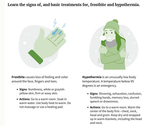 The FEMA page reminds us that during the winter season, there is a higher risk of car accidents, carbon monoxide poisoning and other hazards. A common hazard comes from frostbite and hypothermia: